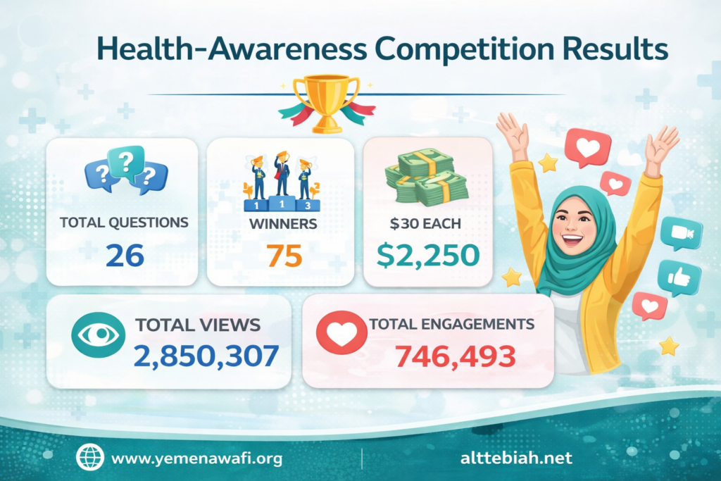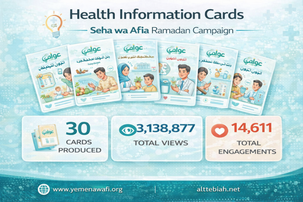 The digital awareness cards played a key role in simplifying and disseminating health messages in an engaging and accessible format. A total of 30 awareness cards were produced and published across Awafi’s platforms and the Almajalah alttebiah social media channels. These cards addressed various health topics, including proper nutrition, maternal and child health, immunization, and combating health misinformation. The activity achieved significant reach and engagement, reflecting its effectiveness in enhancing community health awareness and promoting preventive behaviors.