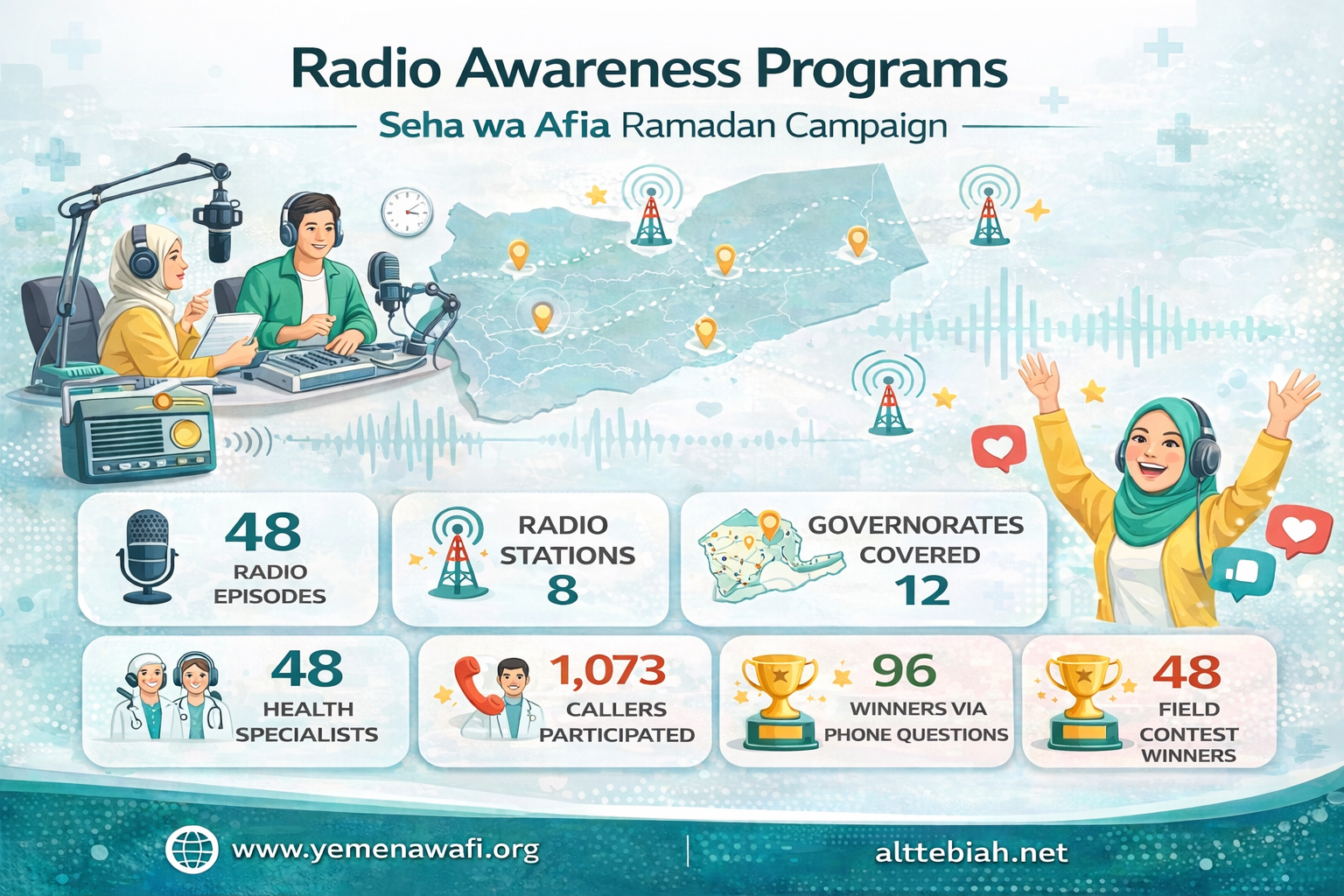 The radio component of the campaign was implemented in collaboration with the General Program for Women and Child Media at the Ministry of Information. A total of 48 radio episodes were produced and broadcast, featuring 48 health specialists who discussed key health topics. The programs witnessed significant public interaction, with 1,073 callers participating. Additionally, 96 winners were selected through phone-in questions and 48 winners through field questions.The broadcasts covered 12 governorates, where the total population is estimated at around 7.15 million people, indicating the potential audience reach of radio, especially in areas with limited internet access.